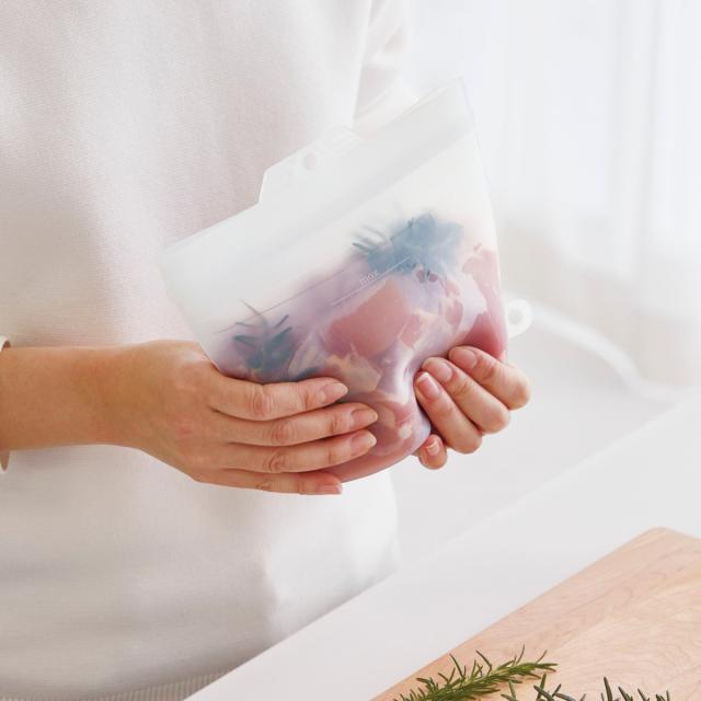 シリコンでできているので、湯せんでの加熱、下味調理や常温保存、冷蔵庫や冷凍庫保存とオールマイティーに使えます。洗って繰り返し使えるので環境にも優しいサステナブルなシリコンクックバッグです。