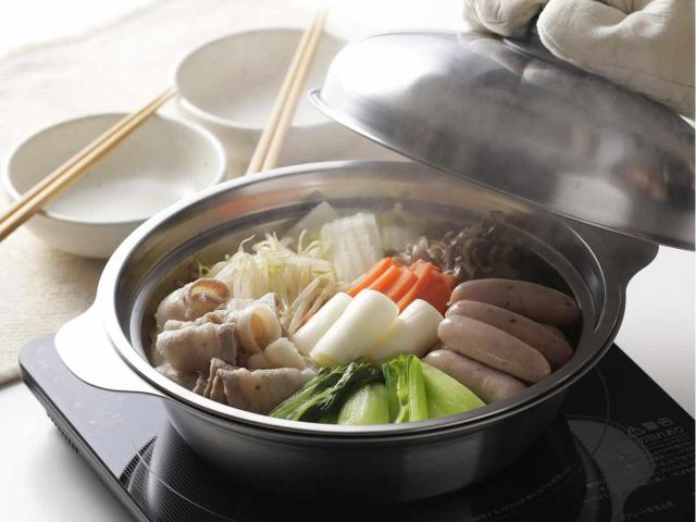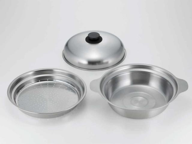 卓上鍋と蒸し器がひとつになったステンレス製の鍋です。24cmサイズでたっぷり4、5人前の鍋料理が作れます。サビにくく、耐久性に優れているので、永くご愛用いただけます。新潟県燕市で生産された、安心・安全の日本製です。