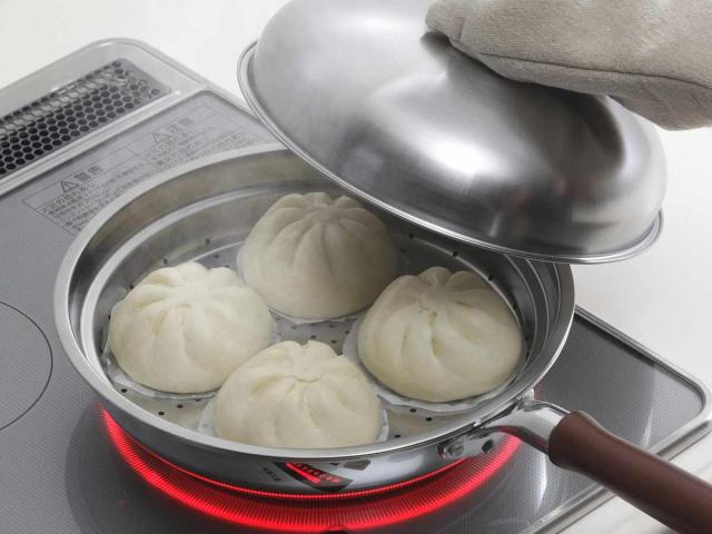 水を張った手持ちのフライパンに蒸し皿をのせるだけで、簡単・手軽に蒸し料理をすることができます。24〜26cmのフライパンに対応しています。蒸すことで、食材の旨みを残したまま加熱することができ、トウモロコシや枝豆は甘く、シュウマイや肉まんはふっく美味しく仕上がります。