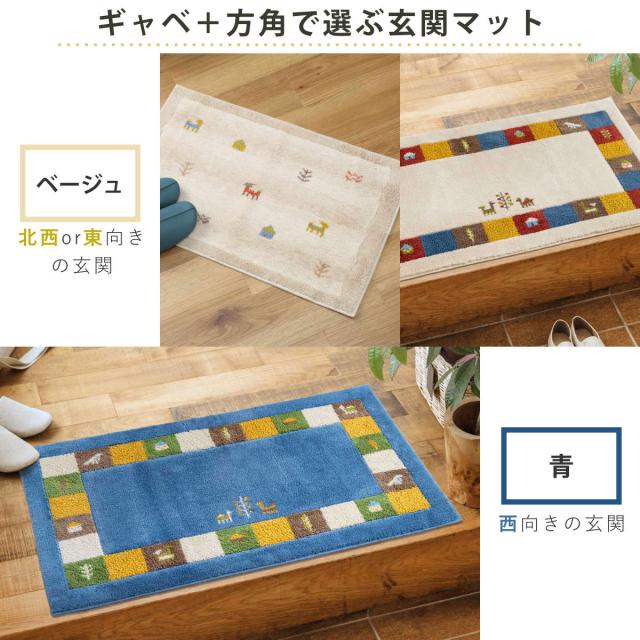 遊牧民に愛されてきたギャベには、家族の絆や自然への敬意が込められています。風水では、八方位それぞれにラッキーカラーがあり、北西・東向き玄関はベージュ、西向き玄関は青など、ギャベと風水を組み合わせ、調和の取れた色選びをするのもおすすめです。