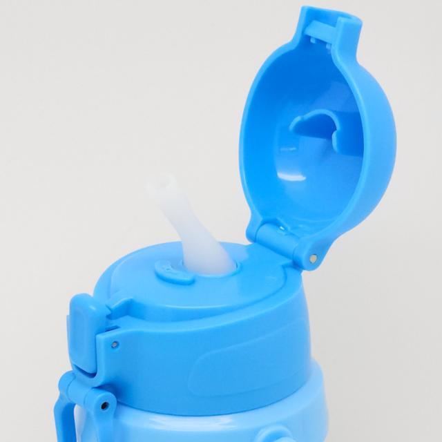 水筒の蓋はボタンを押すだけで開けることができるワンタッチ式なので小さなお子様でも簡単に開けられます。 ロック機能付きで持ち運びにも安心です。
