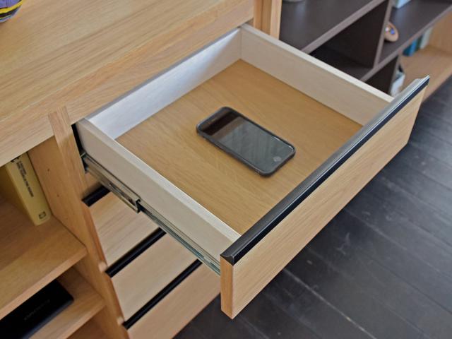 引出しはフルスライドレール仕様なのでスムーズに開閉ができます。手前まで引き出せてしっかり中が見えるので、物の出し入れがしやすいです。