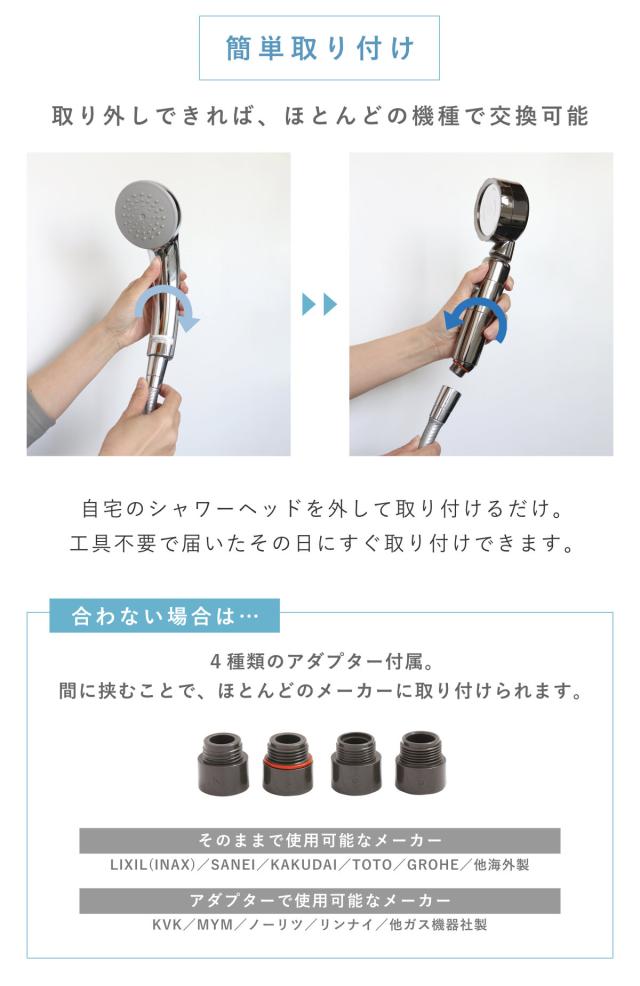 | 注意事項 | ※ご注文前にご自宅のシャワーヘッドが取り外し可能かをご確認下さい ※バランス釜のお風呂には使用できません ※パッケージサイズや付属品は製造ロットによって一部異なります |