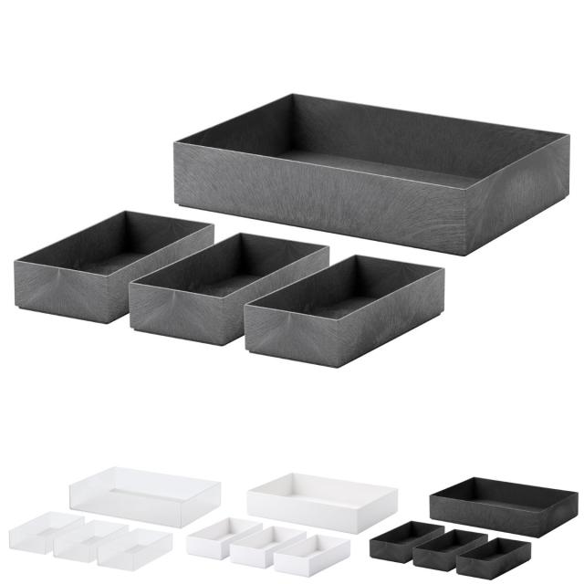 浅型収納ボックス×1個、浅型インナーケース×3個が一緒になった4点セットです。付属しているインナーケース3個は、ボックス内で縦縦縦にも縦横横にも組み合わせられるモジュール設計で、収納する物に合わせて使い分けができます。