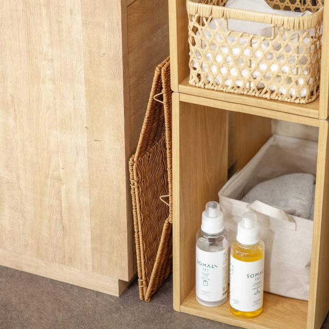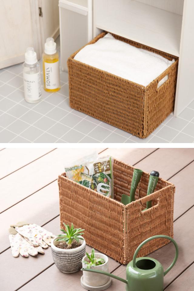 水や湿気に強く多湿な空間でも活躍します。ランドリースペースの小物入れ、ガーデニング用品の収納、観葉植物カバーにもぴったりです。
