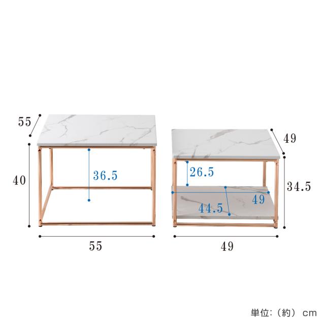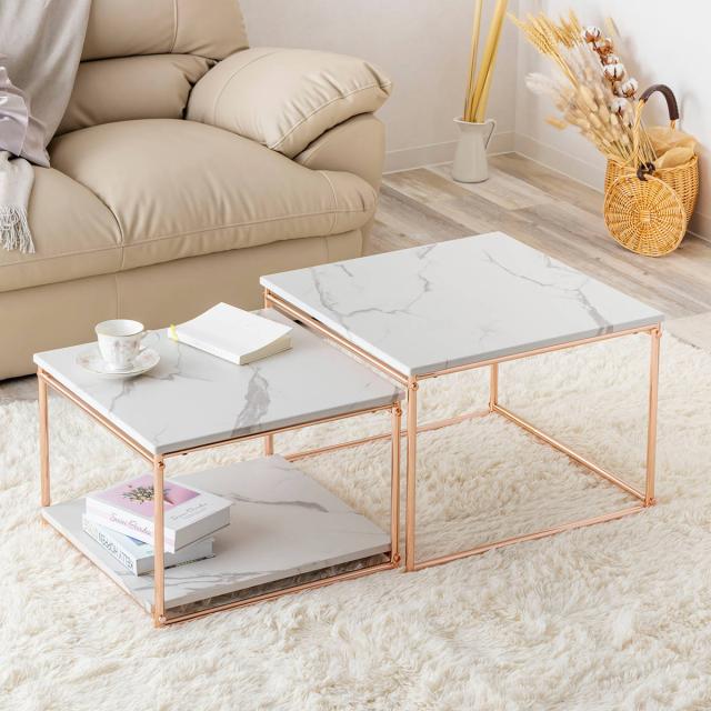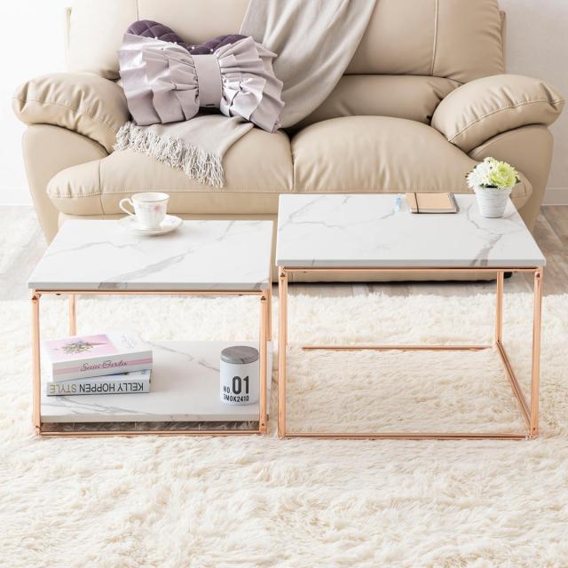 センターテーブル ネストテーブル 幅55cm 幅49cm ( ローテーブル テーブル 大 小 2点セット 大理石柄 長方形 ピンクゴールド メッキ 脚 フェミニン エレガント 高級感 )