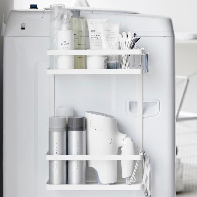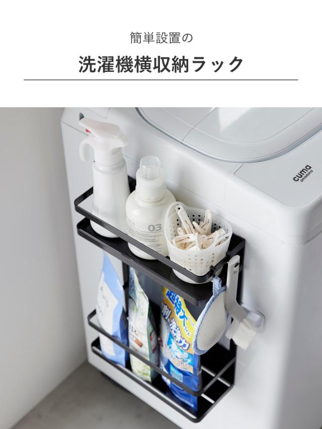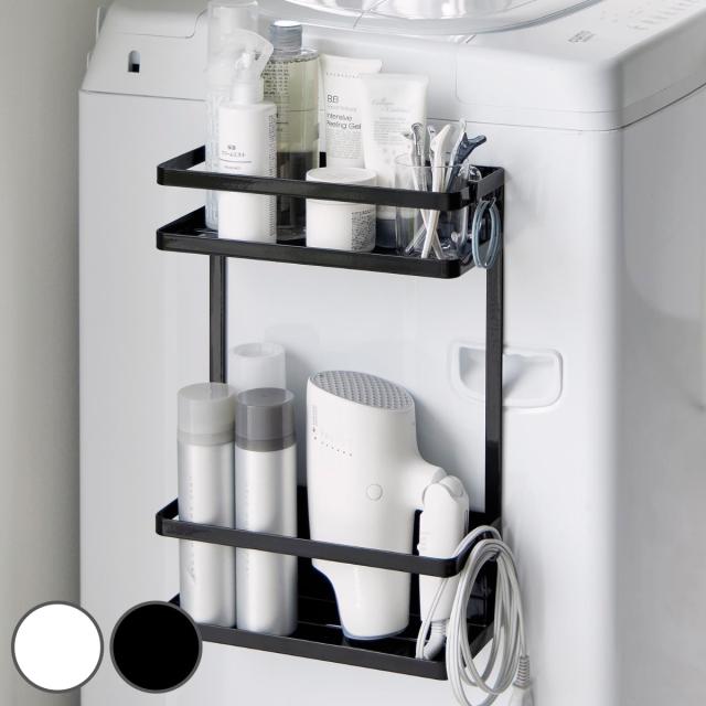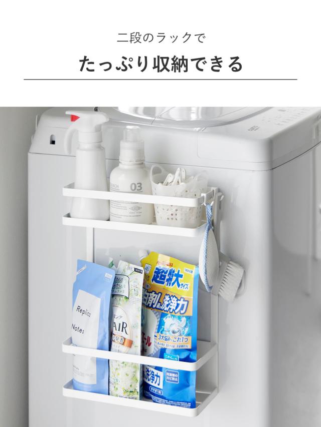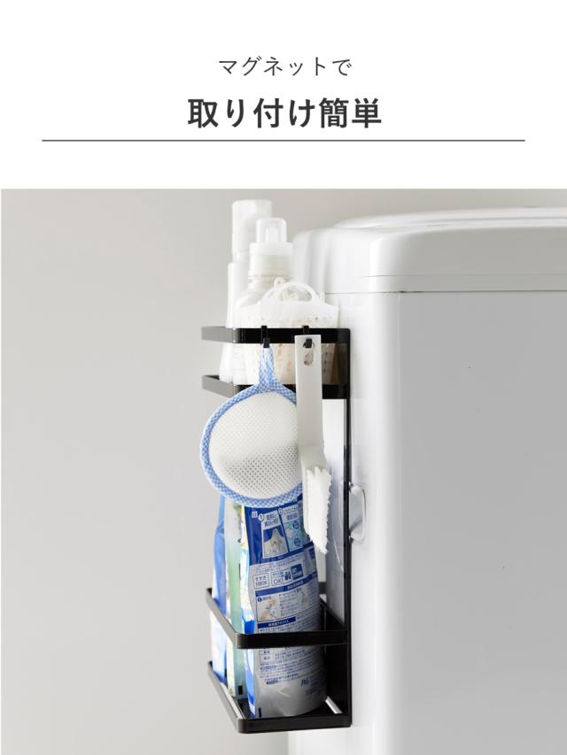 洗濯用洗剤や小物類をまとめて収納できる便利な2段ラックです。洗濯機の側面にマグネットで付けるだけの簡単設置で、洗濯機周りをすっきり整頓できます。