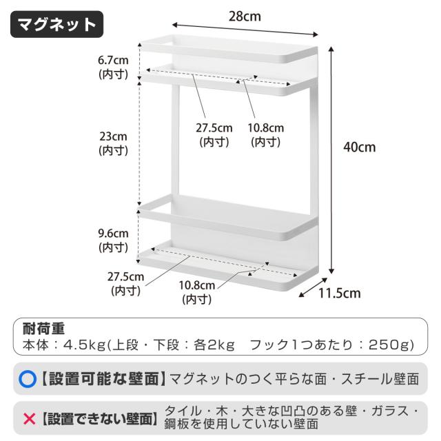 マグネット式なので取り外しも簡単で、位置の変更や調節も簡単です。大きなマグネットでしっかりと支えるので安定感があり、耐荷重は上段、下段各2kgまで対応しています。