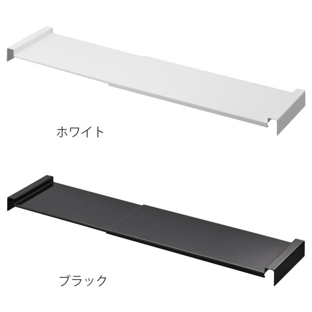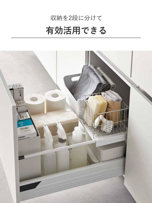 収納を2段に分けて有効活用できる伸縮引き出し中ラックです。引き出しのサイドバーに掛けるだけで収納力がアップします。ストックと日常使いの物を段ごとに分けて収納するのにもおすすめです。