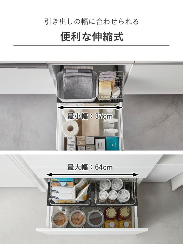 引き出しの幅に合わせて設置できる便利な伸縮式です。サイドバーの間隔が36.5〜63.5cm以内であれば伸縮してピッタリ合わせられます。