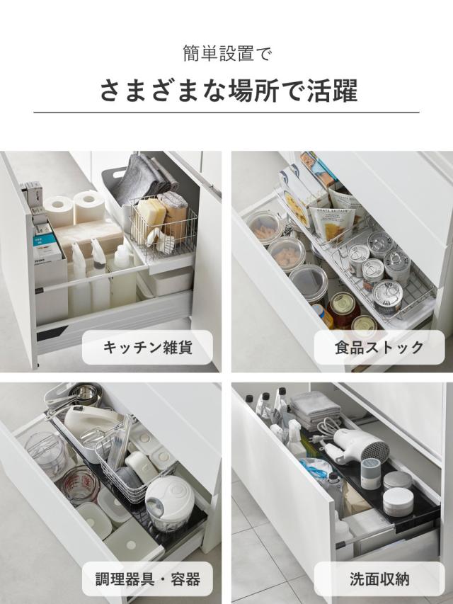 キッチンや洗面台の引き出しのサイドバーに最適です。場所をとる調理器具や保存容器、食品のストックや、ドライヤーなどの洗面グッズの収納にもお使いいただけます。