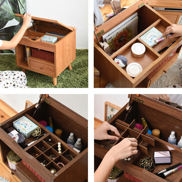 天板を開くと仕切り付きの収納スペースになっています。アクセサリーやメイク道具をまとめて収納でき、奥にはボトルや化粧水など背の高い物も入ります。仕切り板を取り外して左右を入れ替えたり、仕切りを無くして広めのスペースとして使うこともできます。