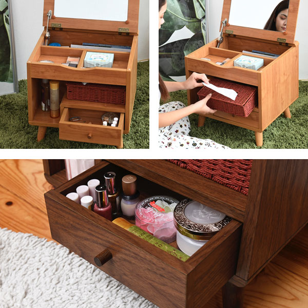 サイドのオープンスペースには化粧水やスプレー缶など背の高い物が収納でき、引出しの上にはティッシュケースを収められます。小ぶりな引出しには、マニキュアやメイク道具のストックなど細かな物を収納してすっきりと片付けられます。