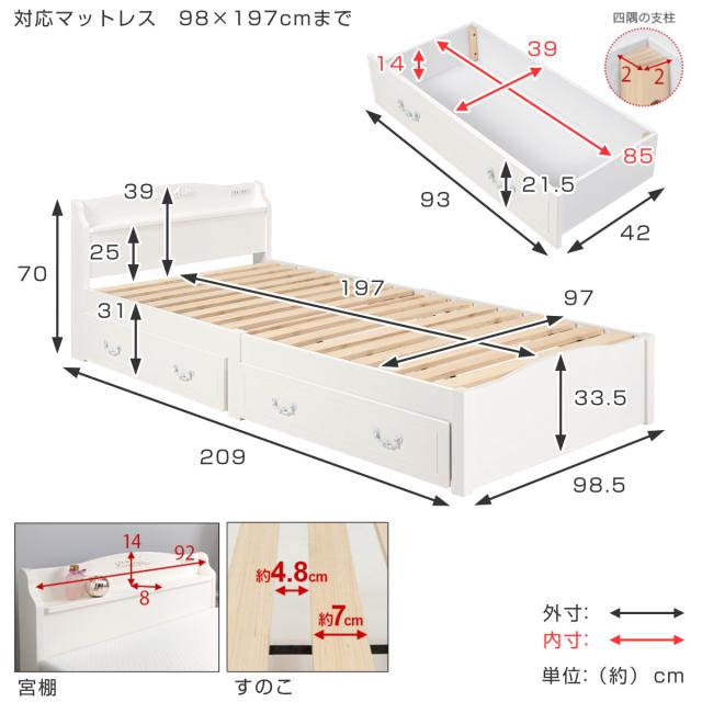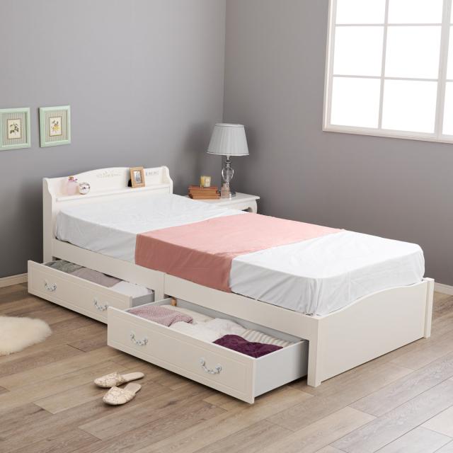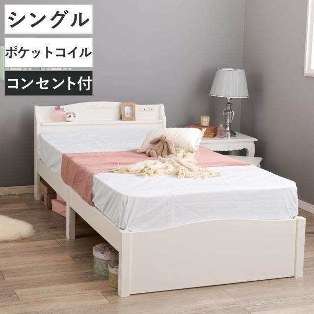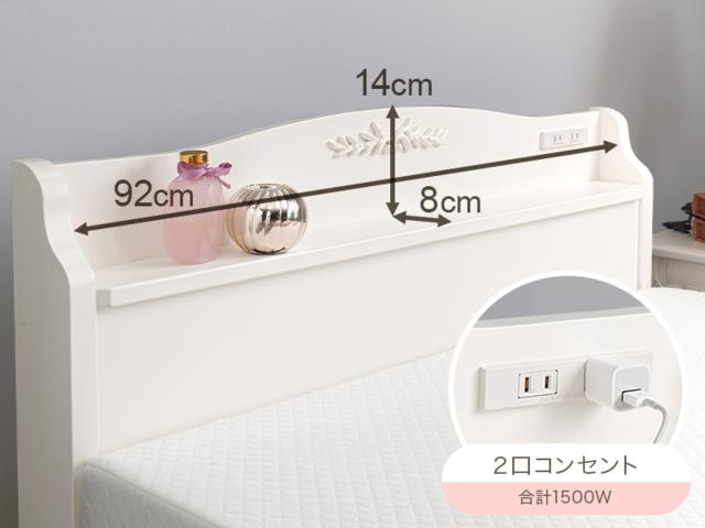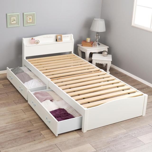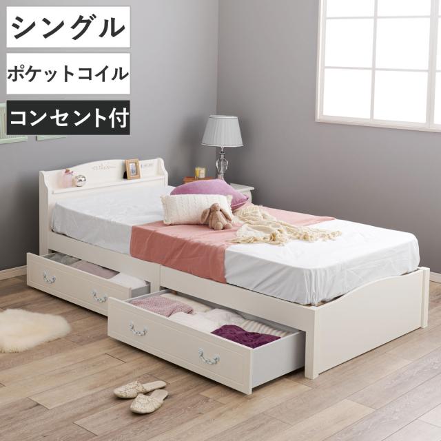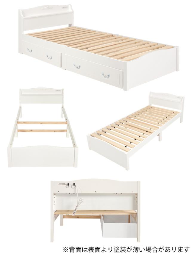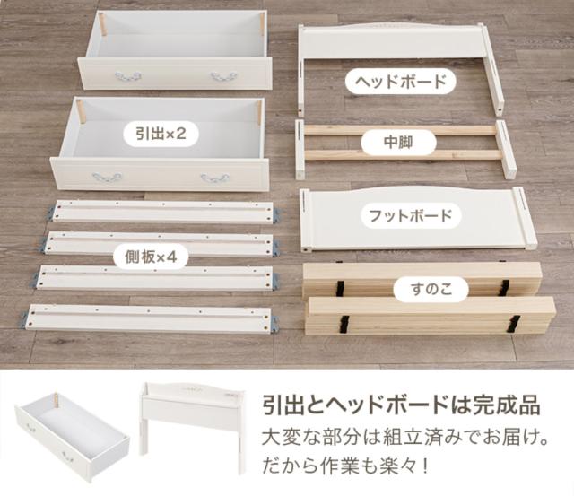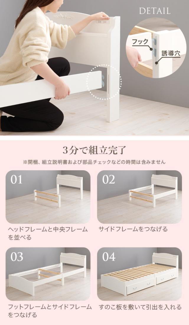 姫系ベッド 引出し収納 3分組立 シングル 工具不要 宮棚 2口コンセント付 天然木 ( ベッドフレーム 単品 ベット ベッド 簡単 組立 ベッド下収納 ホワイト 白 アンティーク調 カントリー調 )