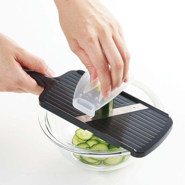 安全ホルダー付きなので、小さくなった野菜や滑りやすい野菜の調理時も最後まで安心です。手を切る心配もないので、最後まで安全にスライスできます。また、ボウルのふちにかけられる切り欠きは、ボウルにしっかり固定できるので便利です。