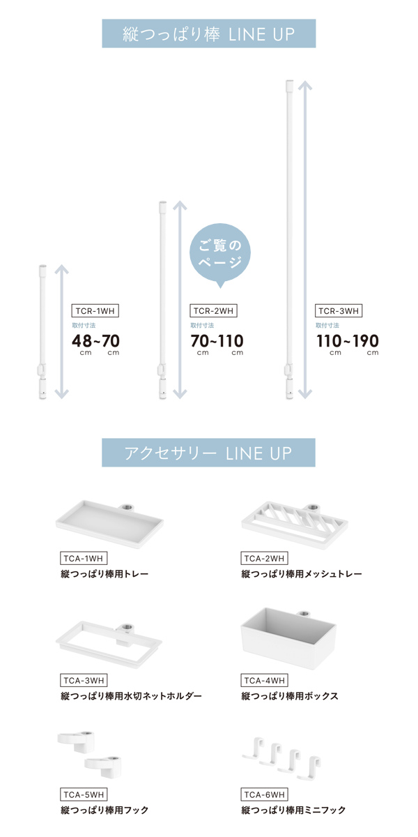 | 注意事項 | ※商品ページ内には別の商品を含む画像を使用しています ※縦つっぱり棒70(TCR-2WH)の商品ページです。対応するパーツは別売りです。 |