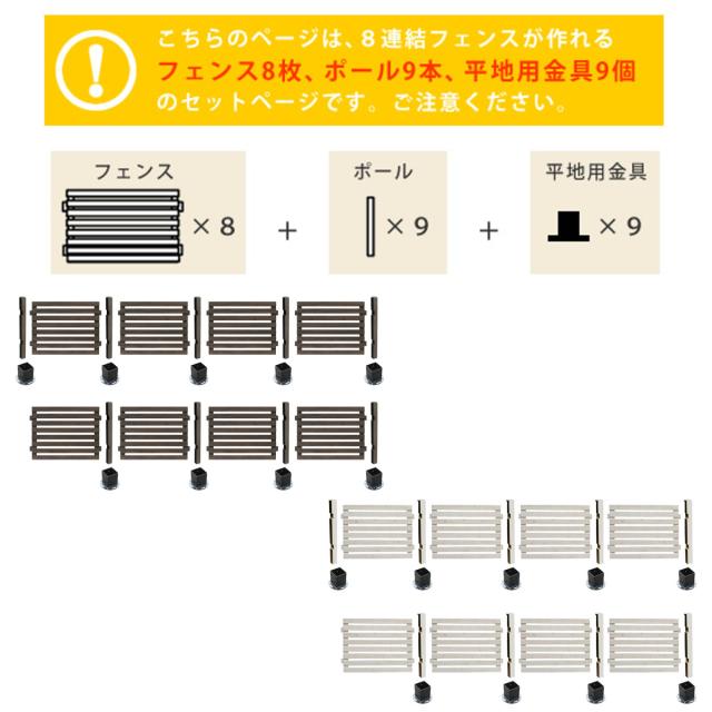 | 内容量 | 8連結セット フェンス×8、ポール×9、平地用金具×9 |