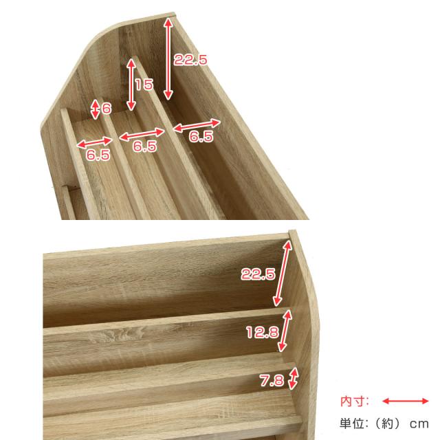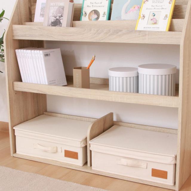 上段は直ぐに取り出したい絵本や雑誌を収納できます。背板は少し斜めの形状でおしゃれなデザインです。見せる収納としてお使いいただけます。