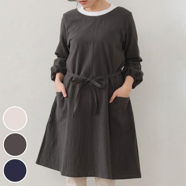 腰紐の着脱で2つのスタイルが楽しめて、ワンピースのようにカジュアルに着られるカッポウギです。カッポウギは上半身から膝丈まで布で覆うので、袖口だけでなく服全体を汚れから守ってくれます。ゆったりとしたフォルムで身体のラインを拾わず、楽に着られます。