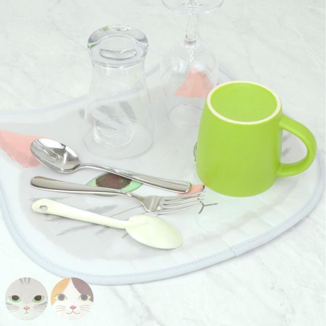 水切りマット ニャンコロディッシュマット シロネコ ミケネコ ( 吸水マット 食器乾燥マット 猫 ネコ ねこ 折りたたみ 丸めて収納 キッチン 食器 乾燥 水切り ドライングマット ディッシュマット おしゃれ かわいい )