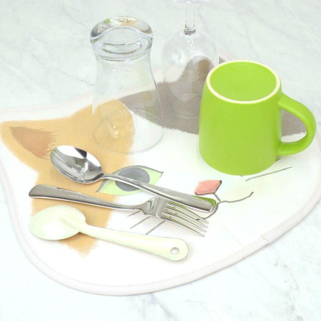猫好きにはたまらない、可愛い猫型の水切りマットです。1〜2人分の食器が置けるサイズで、洗った後の食器を優しく受け止めます。愛くるしい表情で気分を上げてくれます。