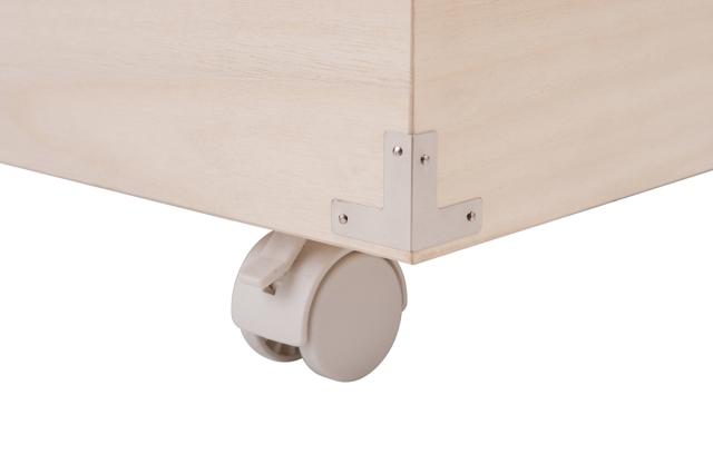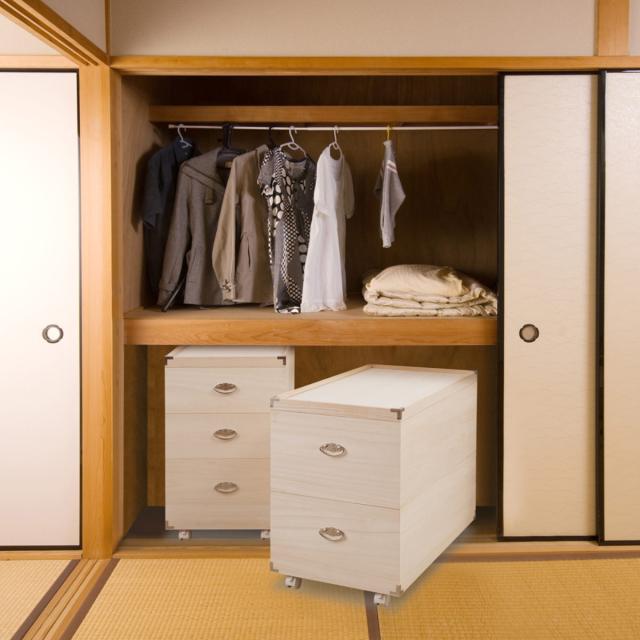 キャスター付きなので、クローゼットや押し入れから出す際に便利です。桐の質感を活かした生地仕上げの本体に合うカラーで、目立ちすぎないのがポイントです。キャスター4個中2個はストッパー付きなので、固定しておけて安心。必要なければ取り外してお使いいただくこともできます。