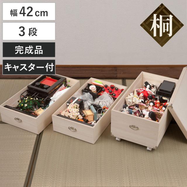 桐 ひな人形ケース 幅42cm 3段 キャスター付 日本製 完成品 ( 収納ケース 雛人形 天然木 押し入れ 木箱 収納 家具 桐箱 お雛様 五月人形 七段飾り 保管 保存 調湿 防虫 シンプル キャスター )