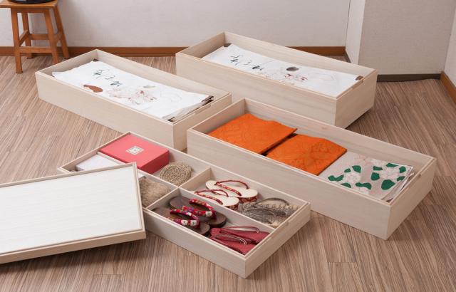 一般的な衣装ケースよりもゆったりとした作りなので、少し大きめのたとう紙でも折らずに収納できます。上段は取り外せる仕切り板付きで、草履やバッグなどの和装小物も一式まとめて整理できます。