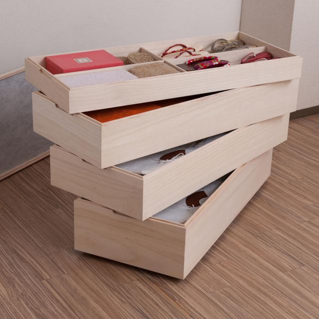 積み重ねれば、クローゼットや家具などのちょっとしたすき間にも省スペースで収納できます。桐は木材の中でも軽い素材なので、積み重ねる際の負担が少ないのも嬉しいポイント。