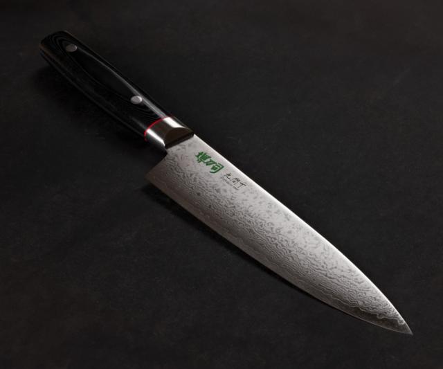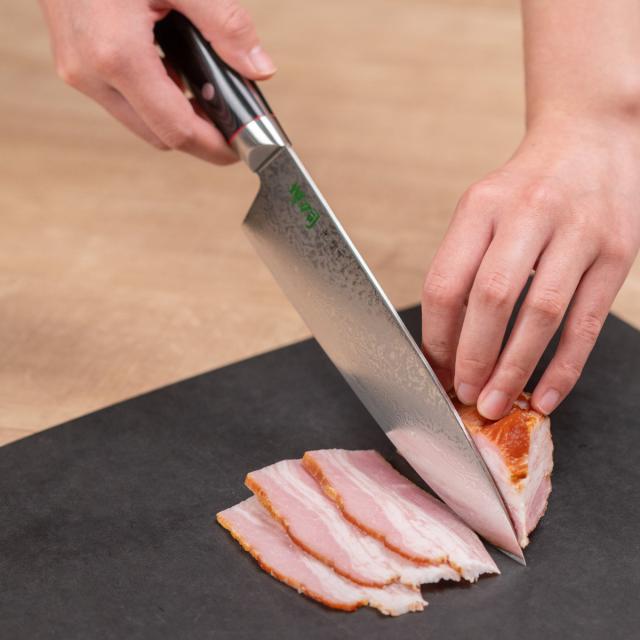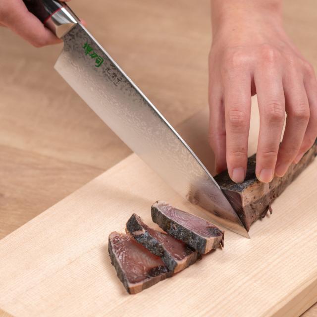 牛刀は前後に引き切るのが得意で、肉の筋などの切りにくいものを切るのに適しています。お肉以外にも、魚や野菜など、幅広い食材に使える万能包丁です。