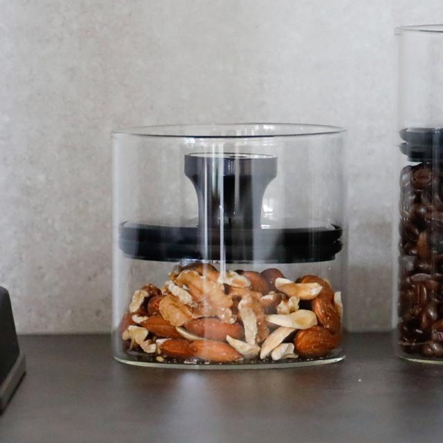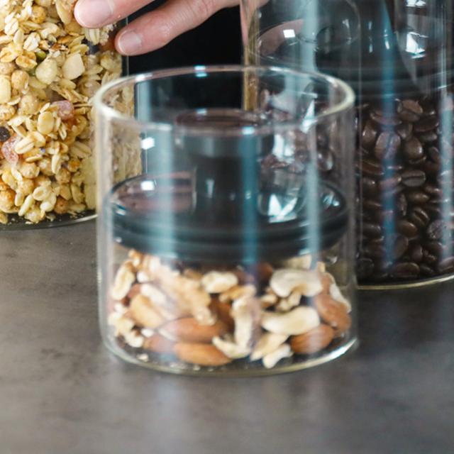 余分な空気を抜いて食材を酸化から守り痛みにくくしてくれる耐熱ガラスキャニスターです。透明な耐熱ガラス製なので、中の食材の種類や残量がひと目でわかりやすく、匂い移りしにくいのも便利なポイントです。
