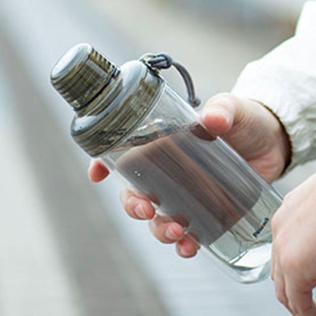 ガラスのような透明感でありながら、傷がつきにくく割れにくい樹脂素材のウォーターボトルです。耐熱温度は80度で、白湯など温かい飲み物を入れてお使いいただくこともできます。また、環境に配慮したBPAフリー素材なのもうれしいポイントです。