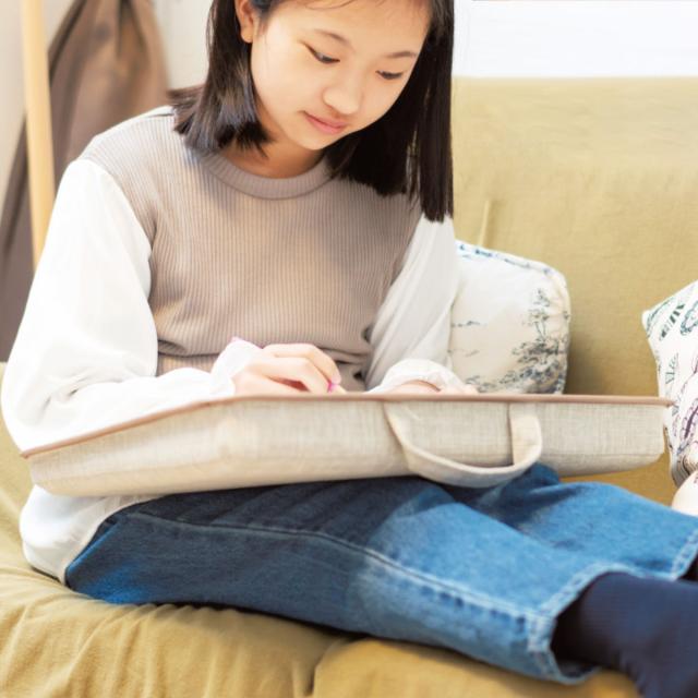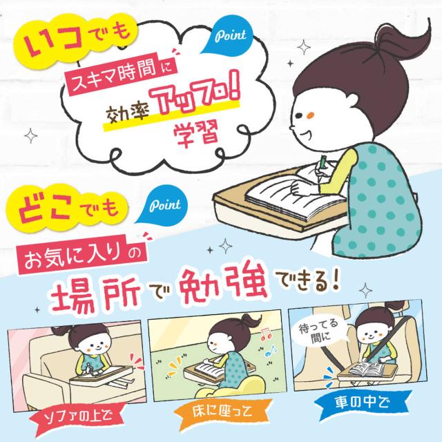 いつでも、どこでも、ちょっとしたスキマ時間に勉強できるクッション付きデスクです。ソファや床に座っている時や車の中で待っている時なども、マイデスクを持ち出して勉強ができます。