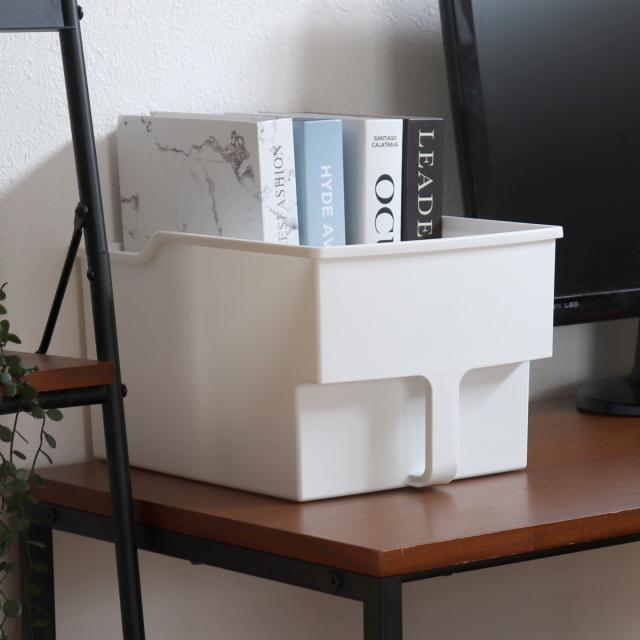 食品や消耗品の収納に便利な取っ手付き収納ボックス。一般的な吊戸棚は奥行き約36cmのものが多いため収納して扉も閉めれるように奥行き約33.4cmに設計されています。お弁当箱や製菓道具、掃除用品などごちゃつきがちなキッチン雑貨の整理に。扉のない吊戸棚でも生活感を出さず見た目もすっきり収納できます。