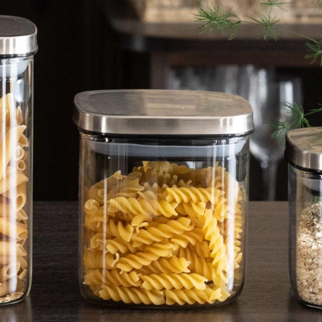 ステンレス製のフタとガラス製の本体がスタイリッシュなキャニスターです。ナッツ類やショートパスタ、コーヒー豆などの乾物保存に最適です。ガラス製なので保存状態や残量の確認がしやすく、詰替えのタイミングが分かりやすいです。また、においや色移りがしにくく汚れが落ちやすいのも嬉しいポイントです。