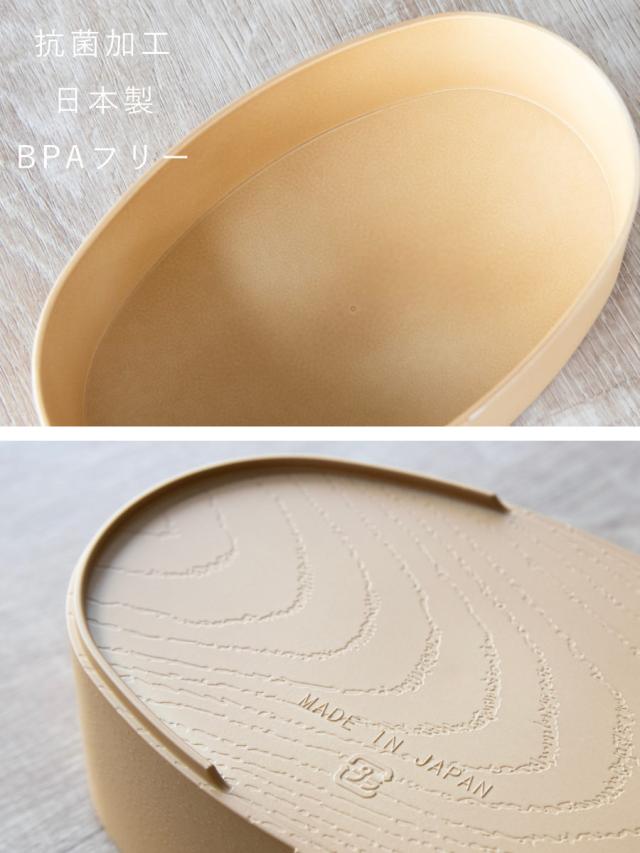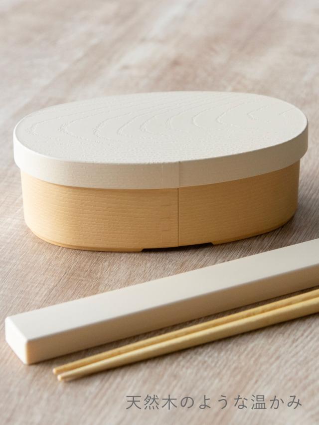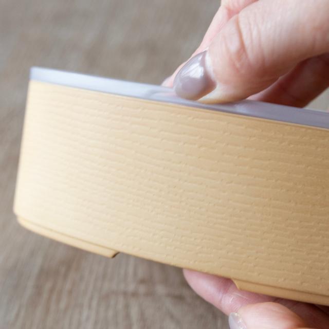 お手入れがひと手間かかる曲げわっぱ弁当箱と比べて、樹脂製は扱いやすいのが特徴です。見た目や木目の質感、継ぎ目もリアルに表現されています。