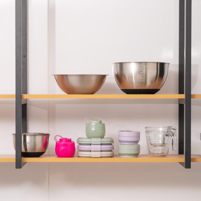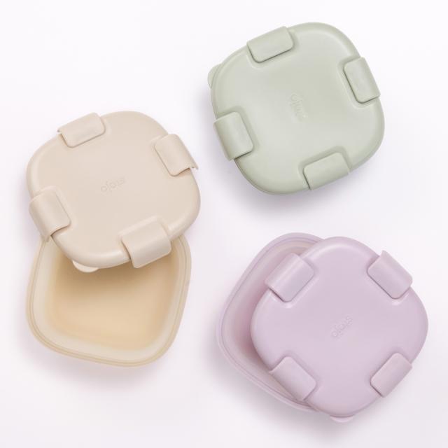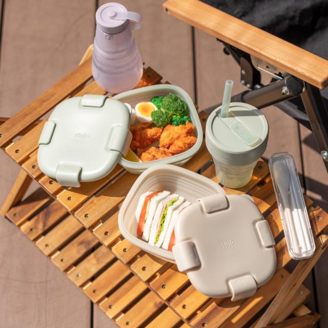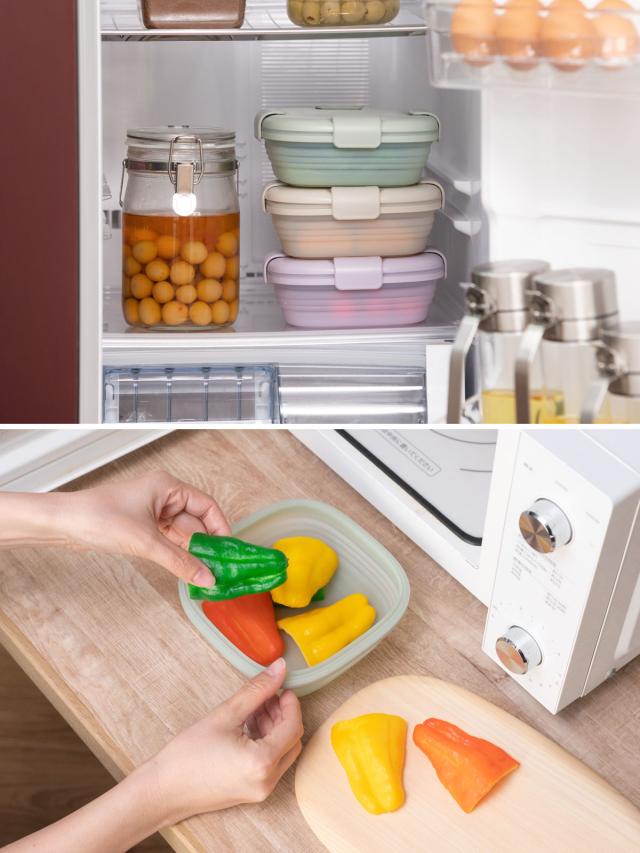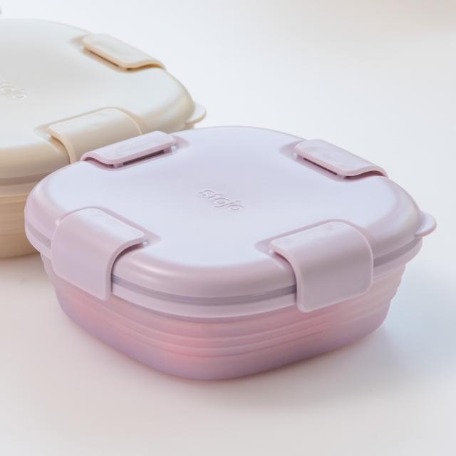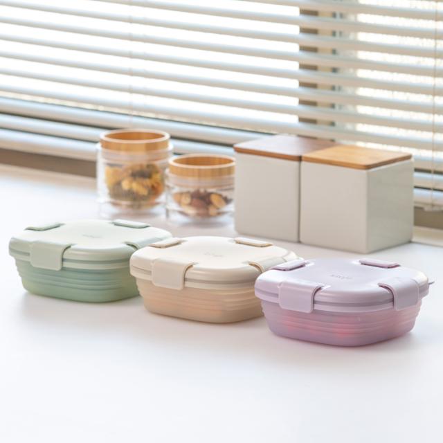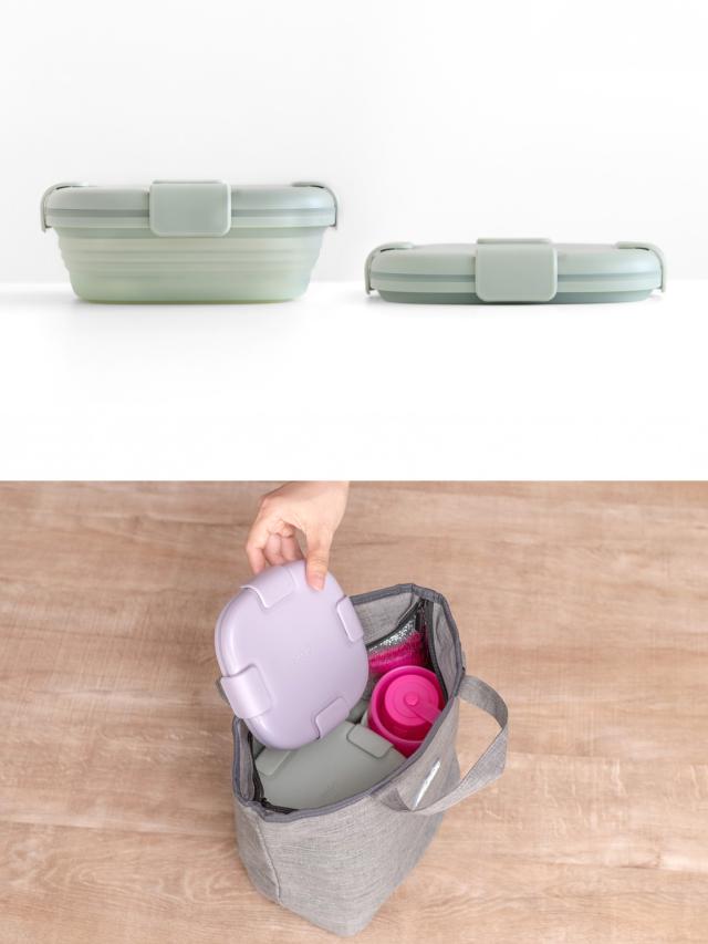 持ち運びに便利な折りたためるランチボックスです。軽くて柔らかいシリコーン素材で、折りたためば高さはわずか2.5cmととても薄くてコンパクトに。フタを外してペタンと潰すだけで簡単に折りたためるので、食後も場所を取らずスマートに持ち運べます。
