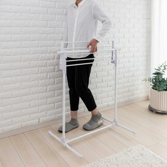 シンプルで使いやすい物干しスタンドです。お部屋に馴染みやすいホワイトカラーです。幅約83〜138cm、高さ約87〜145cmまで調整可能で、丈の長い洗濯物にも対応します。組み立ては工具不要の簡単設計なのもポイントです。