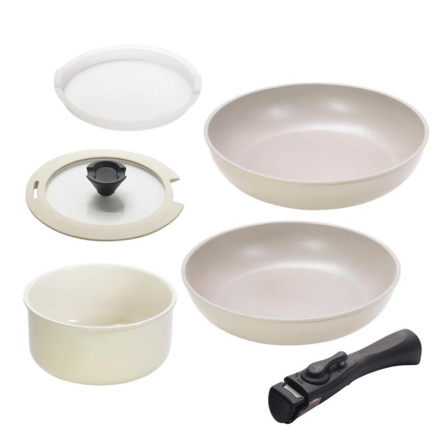 フライパン 鍋 6点セット IH対応 トルティーノ 取っ手が取れるクックウェア ( ガス火対応 着脱式 炒め鍋 ふっ素加工 オーブン対応 軽い いため鍋 マルチパン セラミック加工 アルミ製 ガラス蓋 ホワイト )