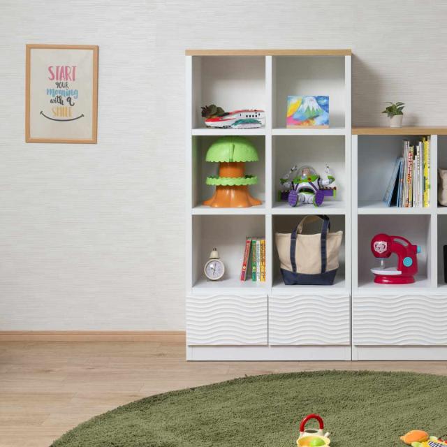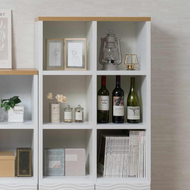 本体のウェーブ柄のホワイトと、天板のナチュラルカラーがマッチしたオープンラックです。飽きのこないシンプルなデザインで、リビングや書斎、子ども部屋など様々な場所でお使いいただけます。