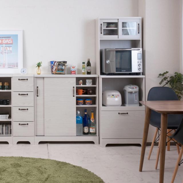 「Late」シリーズのキッチンボード(幅60cm)です。引き戸部・オープン部・引出し部で収納ができ、家電や食器などをまとめて収納できます。ひとり暮らしなどのスペースが少ないお部屋や、天井が低いスペースにも圧迫感なく置けます。