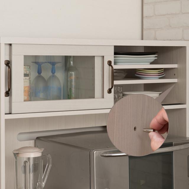 | 材質 | 本体:強化プリント紙化粧繊維板 カウンター天板・スライド棚:ソフトメラミン化粧繊維板 扉枠内:強化ガラス |