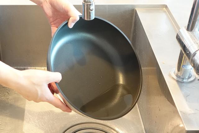 コーティングは、ジャパンクオリティの最高級グレードのダイキン工業株式会社の「Silkware EZ」を採用。こびにつきにくいのでお手入れが簡単で、丈夫で長く使えます。金属ヘラも使用可能です。