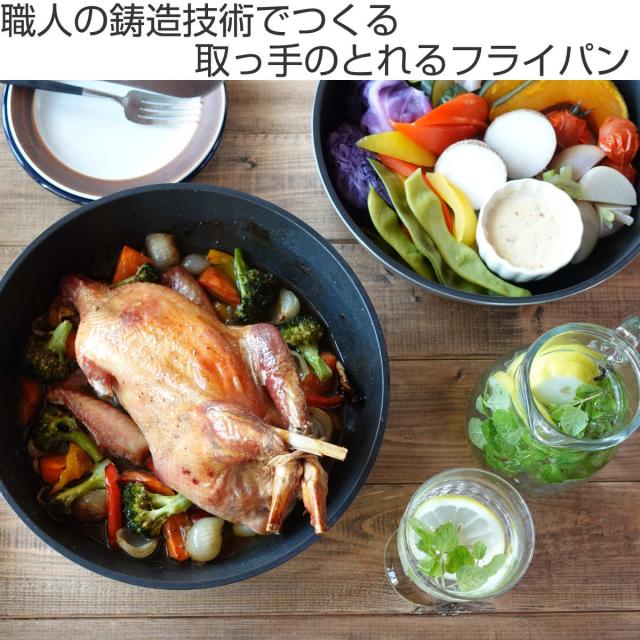 職人の鋳造技術でつくる取っ手のとれるガス火専用フライパンです。焼く、炒める、オーブン調理と幅広い調理に対応します。