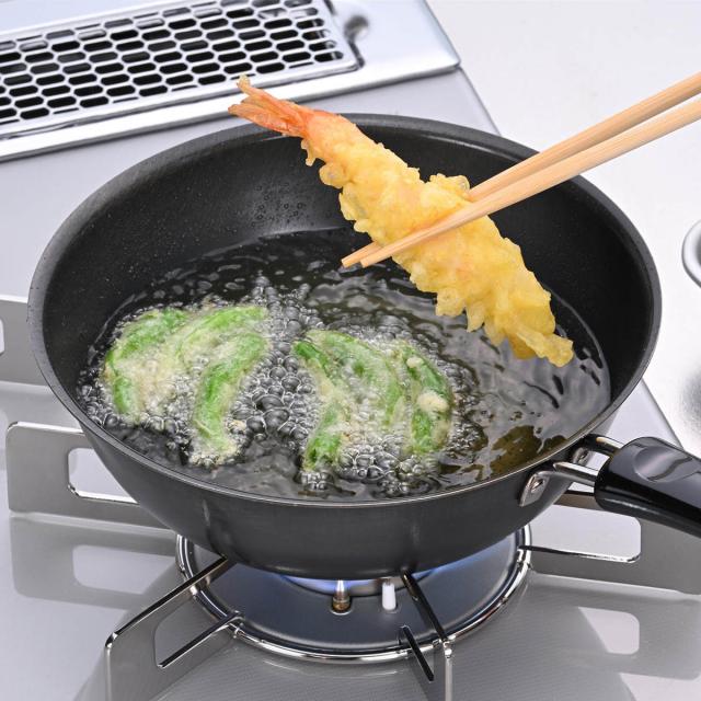 少量の揚げ物や焼き物などにちょうどいい、20cmサイズのいため鍋です。コンパクトで取り回しやすく、朝食やお弁当のおかず作りに重宝します。