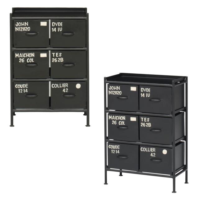 | 注意事項 | ※商品ページ内には別の商品を含む画像を使用しています ※アイアンは湿気に弱い素材の為、雨があたる場所・湿気の多い場所でのご使用や、湿ったものが触れたままでのご使用は錆が発生しやすくなります ※摩耗により他のものへ色移りする恐れがありますので、衣類や繊維製品の収納にはご注意ください ※金属等の硬いものの接触により傷が付き、塗装がはがれる場合がございます ※お届け段階から小さな傷や凹みなどの風合いがあります ※設置後すぐは素材・塗料の臭いがする場合がありますので、お部屋の換気でご対応ください ※引出しのロゴ文字は商品によって異なる場合がございます |