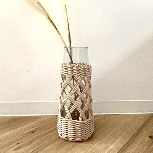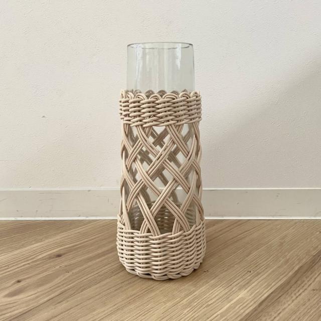 ガラスベースにバスケットのような飾り編みを施した、ナチュラルな雰囲気のフラワーベースです。使い勝手のいいベーシックな形の「円柱型」ボリュームのあるサイズ感でインテリアのワンポイントになります。