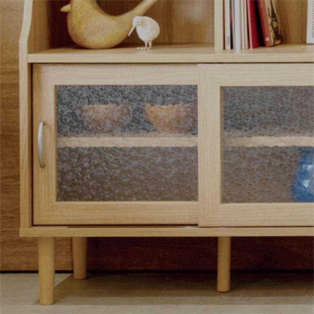 モザイクガラスと丸みのある持ち手がアクセントのガラス扉です。懐かしさを感じさせるモザイクガラスが扉内をぼかすので生活感を隠してスッキリと収納して頂けます。