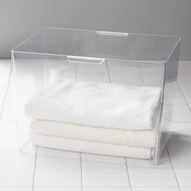 透明度が高い美しいフォルムが特徴の収納ボックスです。中身がひと目で確認できるので、ストック食材や洗剤、コスメ、おもちゃまで、何がどこにあるかラクに把握できます。探さない収納にしておくと、買いすぎ防止や時短にもつながって便利です。