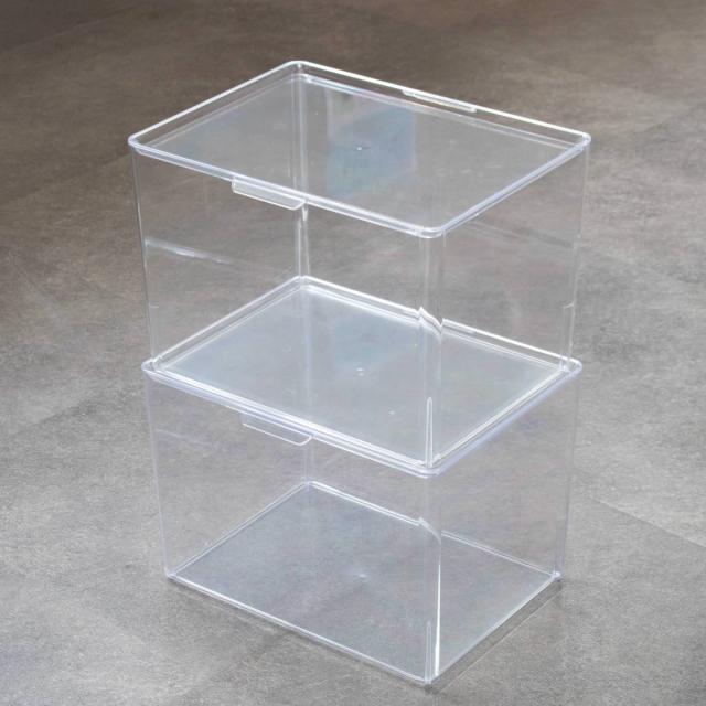 別売りのフタを使うと、ホコリを防ぎながら、縦に重ねて省スペース収納が可能。同じサイズ同士や、サイズ違いのボックスも安定して収納ができます。